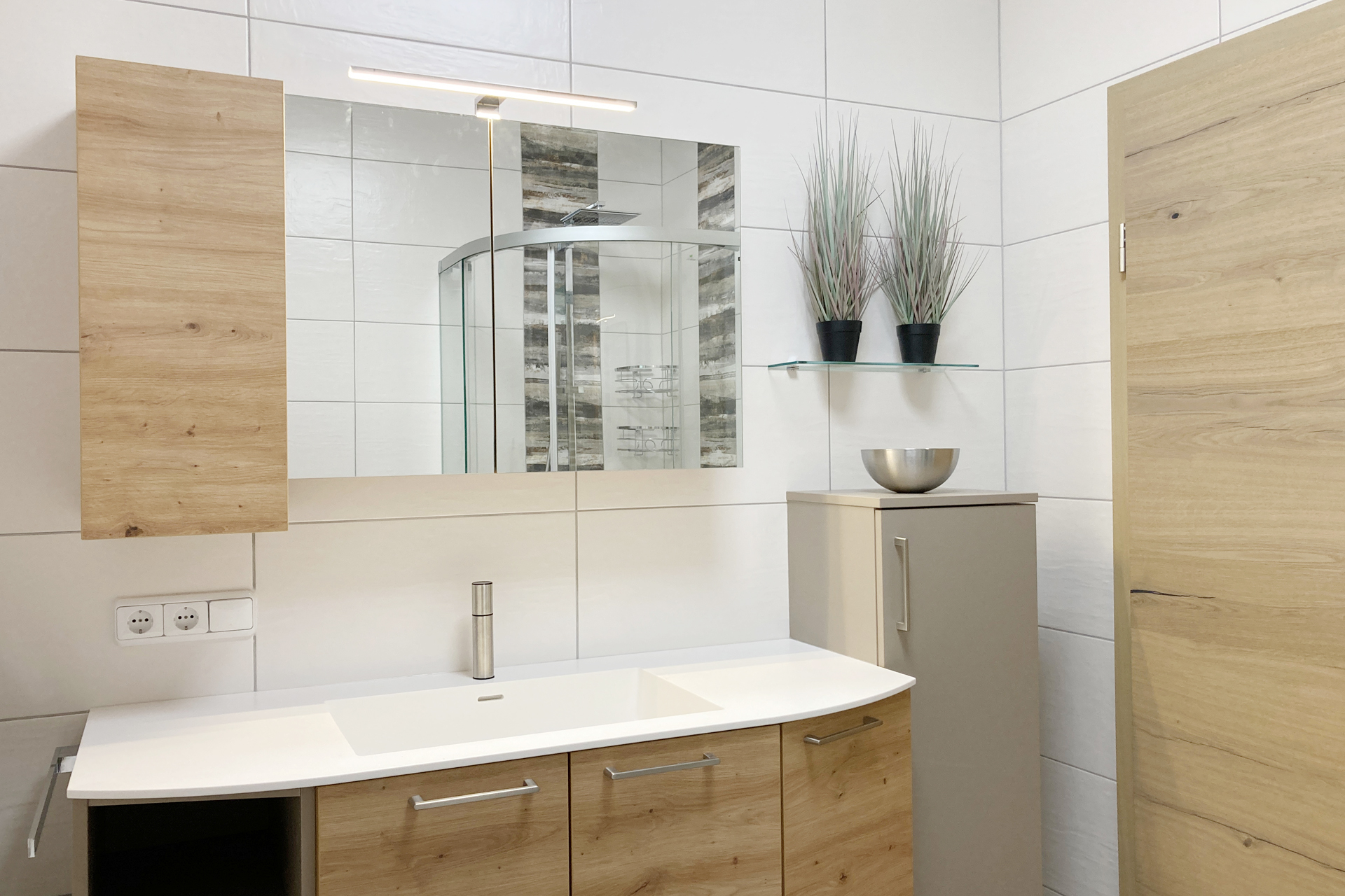 Badmöbel in Asteiche Dekor mit Mineralsteinwaschtisch nach Maß