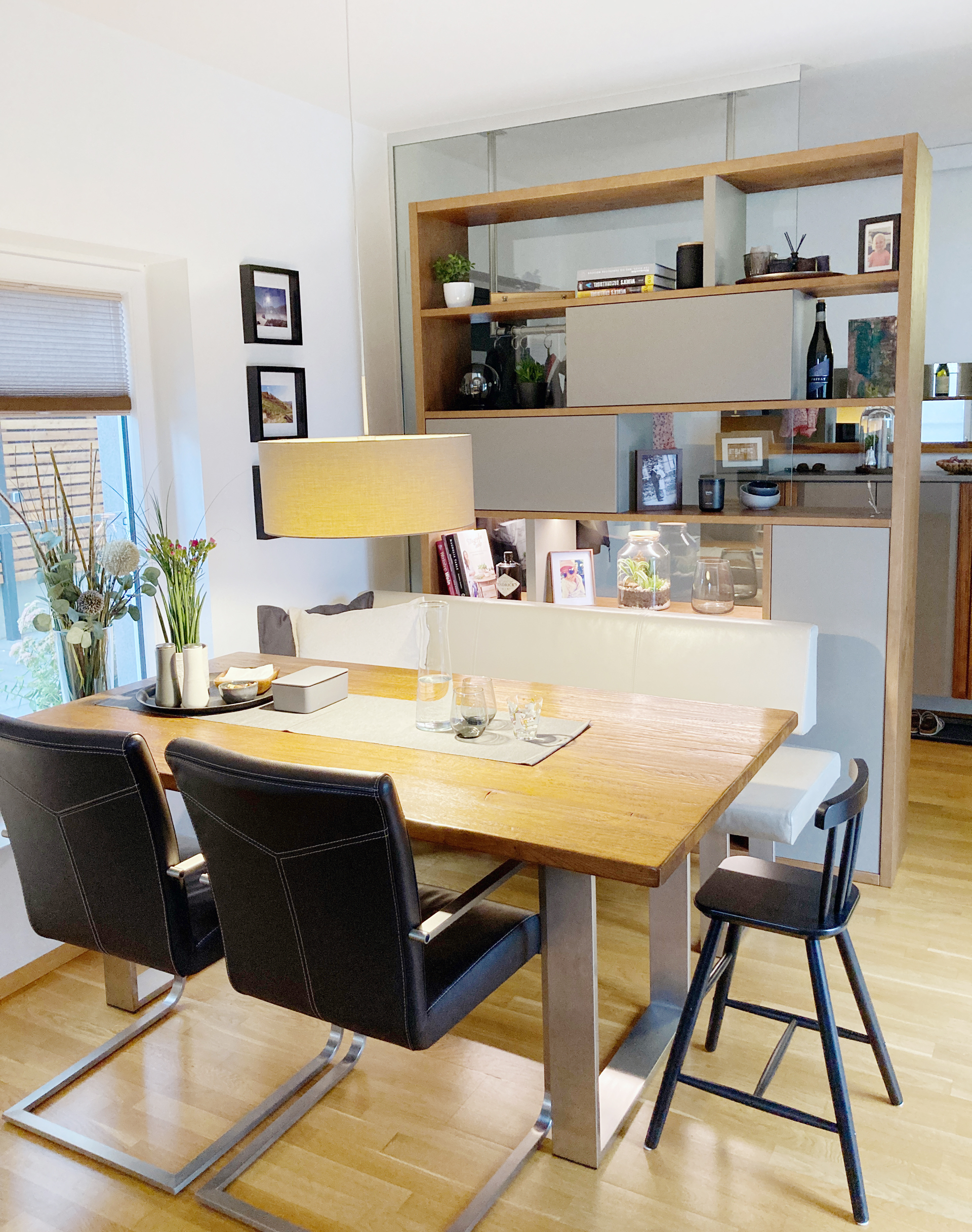 Raumteiler in Nuss mit lackierten Elementen, beidseitig nutzbar, aufgelockerte Abtrennung zwischen Vorzimmer und Eingangsbereich